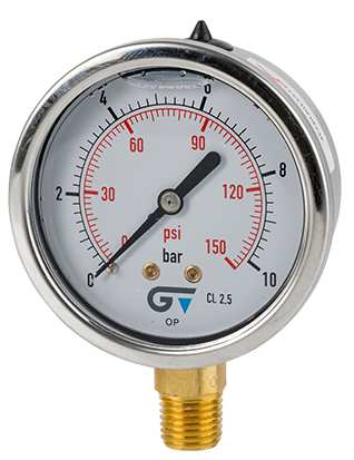 Manometro Ø 63 con glicerina, uscita inferiore, filettatura 1/4" BSP.